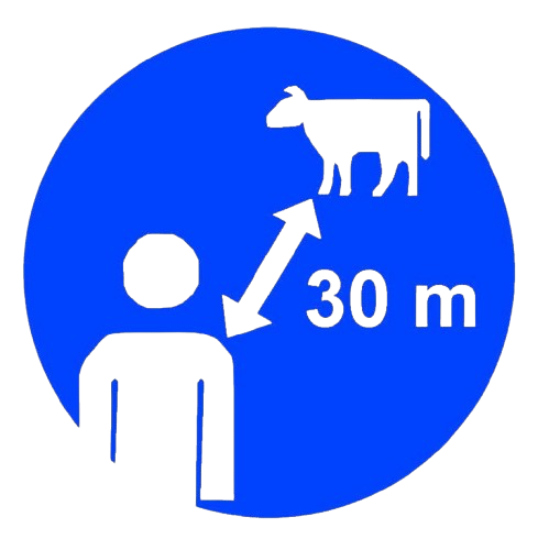 Mindestabstand von 30 m zu den Tieren einhalten. Kreuzen Tiere deinen Weg, warte im Abstand von 30 m. Nimm gegebenenfalls eine andere Route. Gehe ruhig und unauffällig in Distanz an den Tieren vorbei, erschrecke die Tiere nicht und schaue ihnen nicht direkt in die Augen.