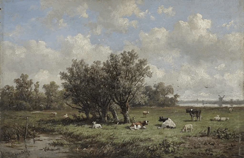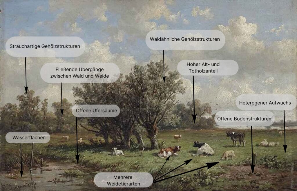 Im Weidemanagement „Wilde Weiden“ formen die großen Tiere ihr Weideareal und gestalten den Mikrokosmos von Strukturen bis hin zu ganzen Landschaften. Es entstehen dabei Bilder, die nicht so einfach mit Worten zu beschreiben sind, zumal hier ein formender Prozess abläuft, der teils viele Jahrzehnte benötigt. Unsere heutigen „Wilden Weiden“ sind dagegen vergleichsweise jung. Zeugnisse von der Vielfalt der Gestaltungskraft der Weidetiere lassen sich entdecken auf vielen Gemälden vergangener Zeiten. So gibt es gerade aus der Schaffensperiode der Romantik in der ersten Hälfte des 19. Jahrhunderts Bilddokumente, in denen Künstler mit Detailliebe geradezu photographisch dem Kenner das Wirken der Pferde und Rinder offenbaren. Harmonische, pastorale Landschaften waren ein beliebtes Motiv bei Malern und ihren Kunden. Einer der vielen Künstler aus dieser Zeit war der Holländer Anthonie Jacobus van Wijngaerdt (1808-1887), der als Landschaftsmaler bekannt wurde. Ohne Zweifel war es nicht seine Absicht, ein „Suchbild“ zu Weidespuren zu malen. Der akribische Realismus seines hier gezeigten Bildes führt fast zwangsläufig zu Interpretationen eines Ökologen aus einer Zeit, als große Weidegänger und nicht Mähmaschinen das Landschaftsbild prägten. Sie sollen im folgenden Bild herausgehoben werden.