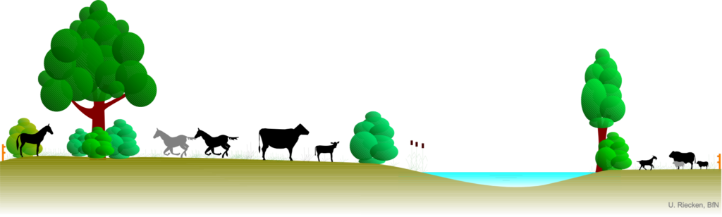 Die großen Weidetiere waren mit Fraß, Tritt, Dung und ihrem Samentransport die wesentlichen Landschaftsgestalter in der vom Menschen noch nicht geprägten Naturlandschaft. Die historische, vorindustrielle Nutzung der Landschaft, die durch täglichen Austrieb der Dorfkuhherden geprägt war, lässt sich mit ihrem sehr positiven Einfluss auf die Artenvielfalt durchaus vergleichen.