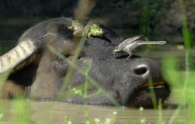 Die Fliegen profitieren von Sekreten der Büffel und müssen sich vor hungrigen Insektenfressern wie der Bachstelze hüten.